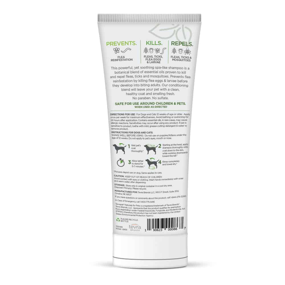 Tevrapet® Naturals Flea & Tick Shampoo for Pets is a powerful, yet soothing spa-like shampoo for dogs & cats with a botanical blend of essential oils proven to kill fleas & ticks, and repel mosquitoes. Prevents flea reinfestation by killing flea eggs & larvae before they develop into biting adults. Our conditioning blend will leave your pet with a clean, healthy coat & smelling fresh. No paraben. No sulfate. Safe for use around children & pets when used as directed. For dogs & cats 12 weeks or older.