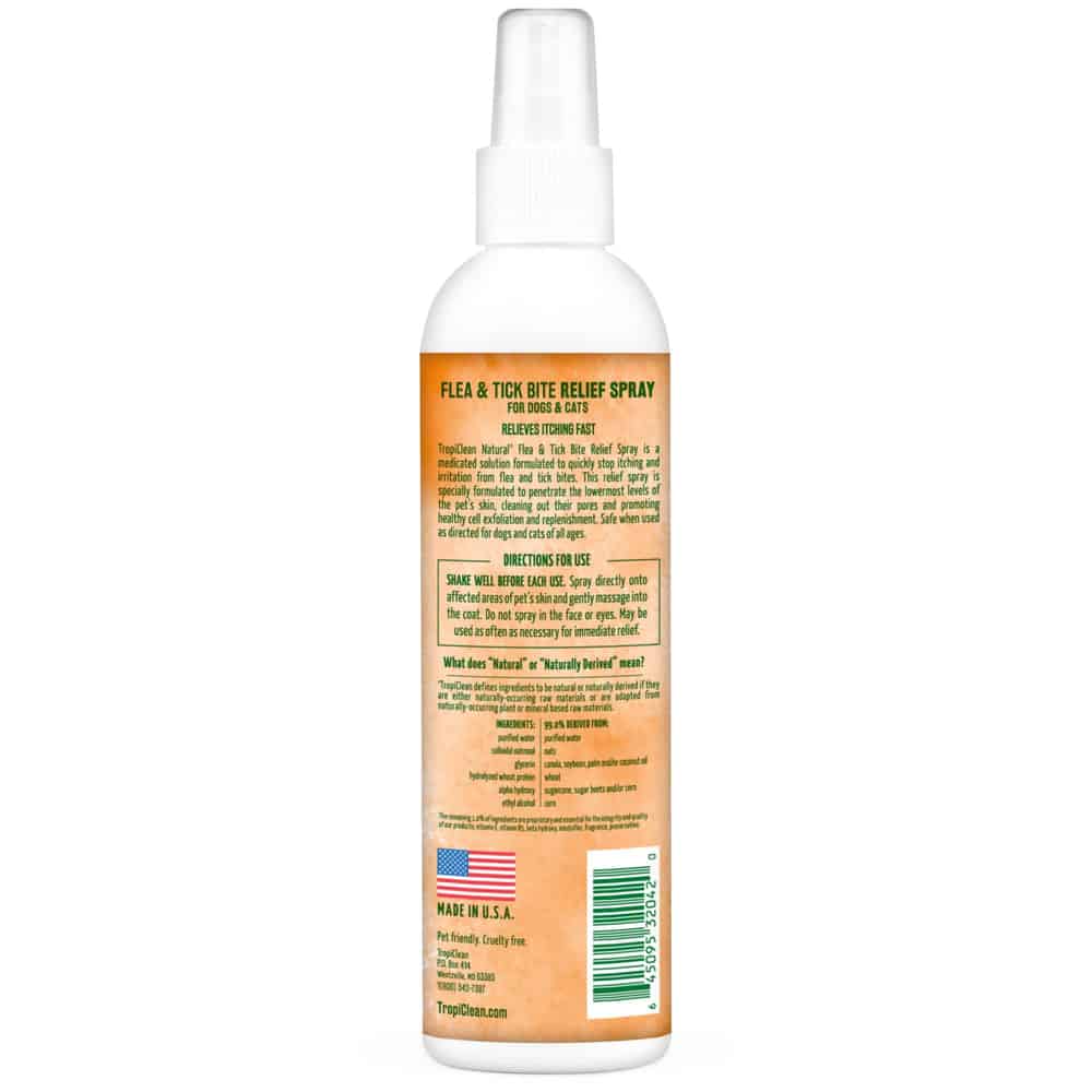 TropiClean Pet Products offers a full range of naturally derived dog and cat products including TropiClean Grooming Products, SPA by TropiClean, TropiClean OxyMed, TropiClean PerfectFur, TropiClean Enticers, and TropiClean Fresh Breath Oral Care and Dental Products. Suitable when used as directed for dogs and cats 12 weeks and older. Contains one (1) 8oz bottle of TropiClean Natural Flea & Tick Bite Relief Spray.