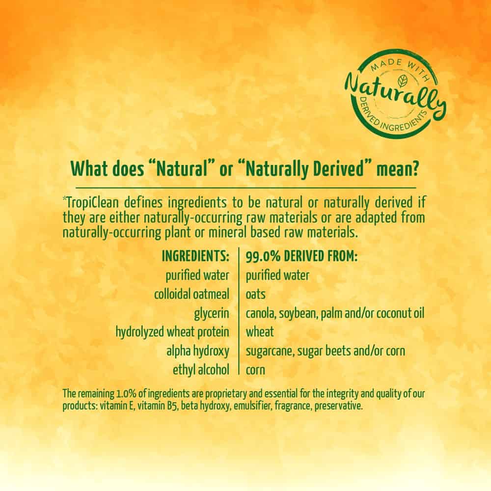 - Naturally-Derived Ingredients — TropiClean defines ingredients to be naturally derived if they are either naturally occurring raw materials or are adapted from naturally-occurring plant or mineral based raw materials.
