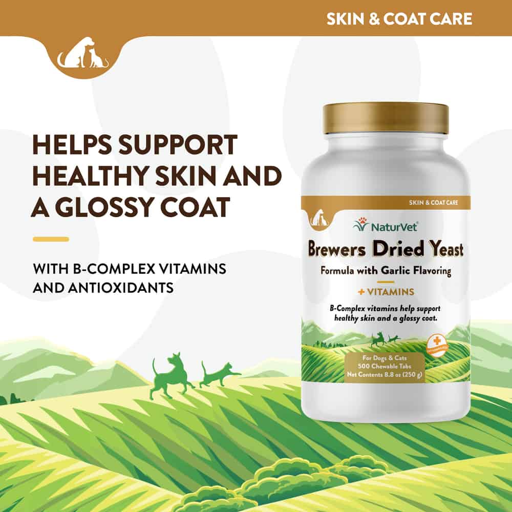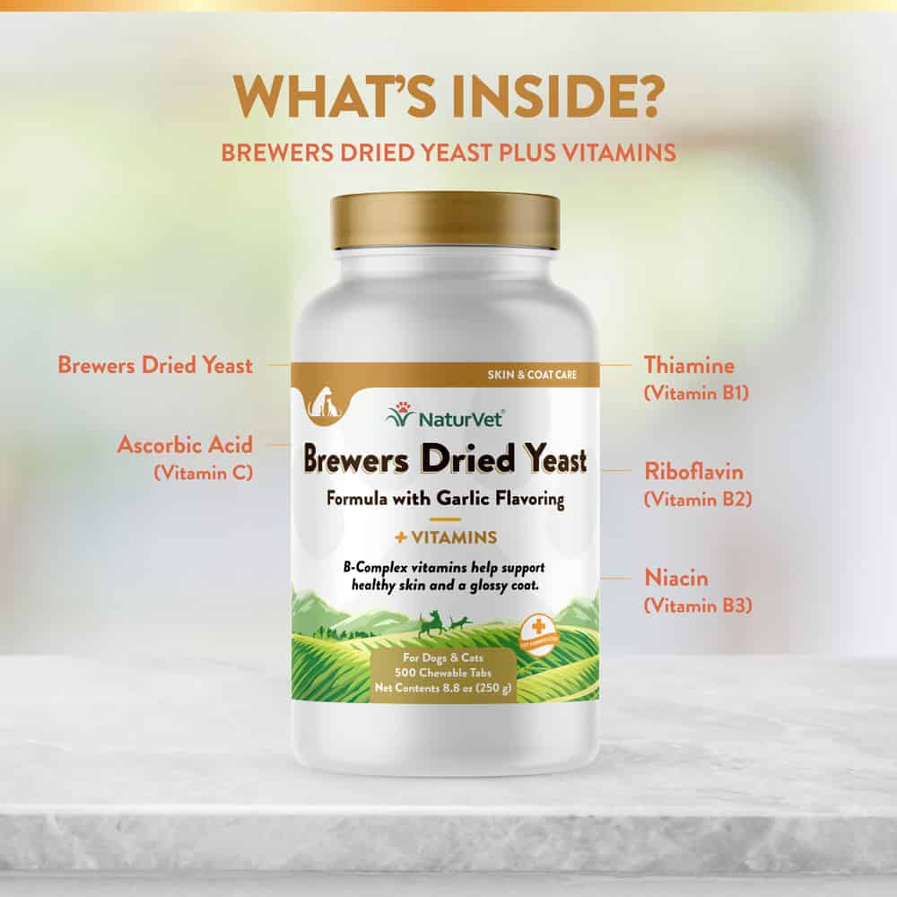 NaturVet Brewers Dried Yeast Formula with Garlic Flavoring Supplement provides a source of B-complex vitamins, Niacin, and antioxidants for healthy skin and a glossy coat.