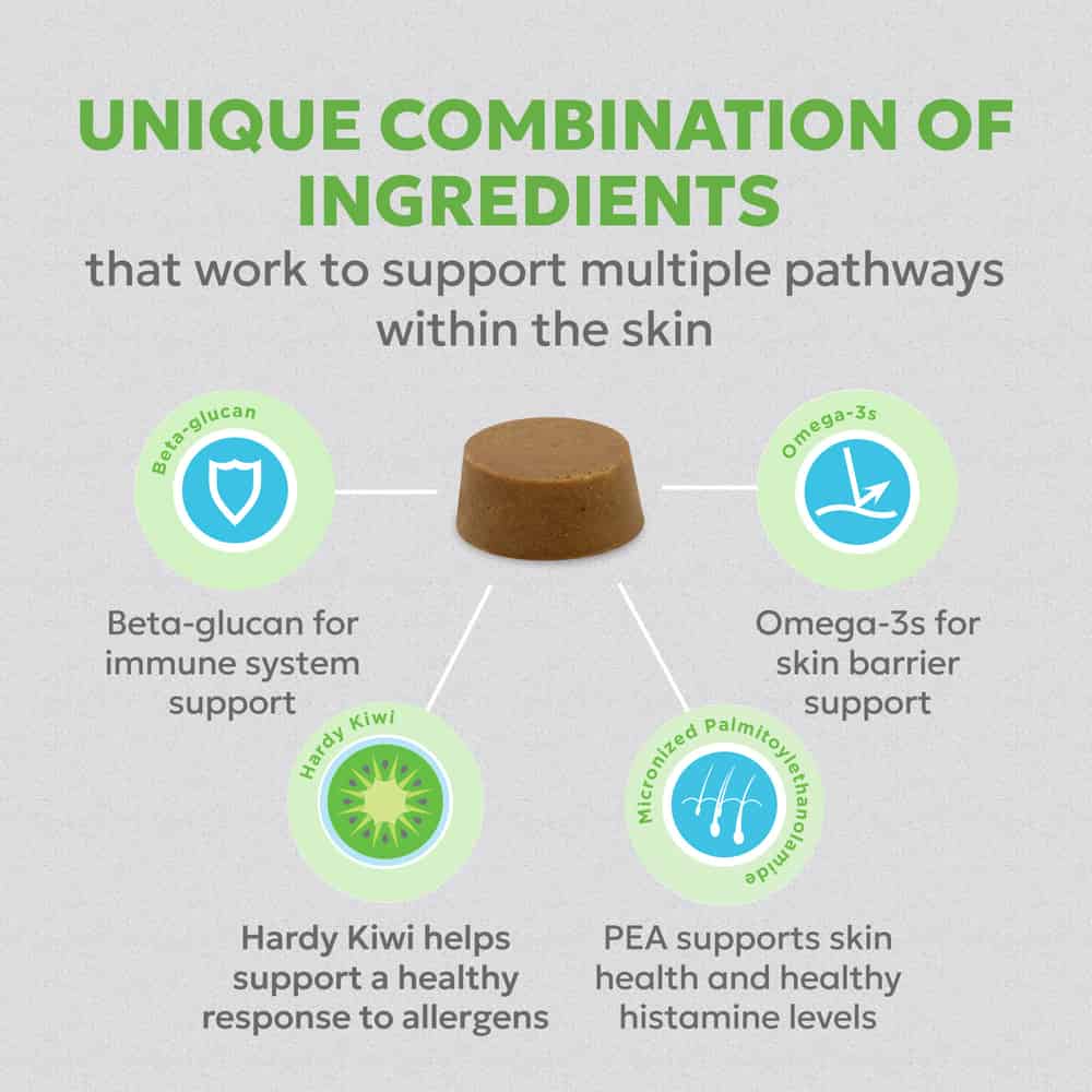 Nutramax Dermaquin Skin Support is a chewable supplement designed to strengthen the skin's natural defenses against environmental allergens in small to medium dogs and cats. Its core function is to support a healthy skin barrier and inhibit inflammatory mediators that lead to irritation. The main active ingredients are a unique blend of Hardy Kiwi extract, beta-glucans, and omega-3 fatty acids to promote comprehensive skin health.