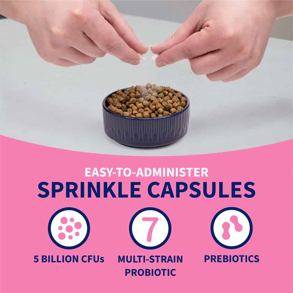 Proviable capsules contain multiple strains of beneficial bacteria, billions of CFUs, and both prebiotics and probiotics to help support intestinal health. The prebiotics help encourage growth of the beneficial Proviable probiotics within the gut. Capsules can be easily sprinkled over your pet’s food.