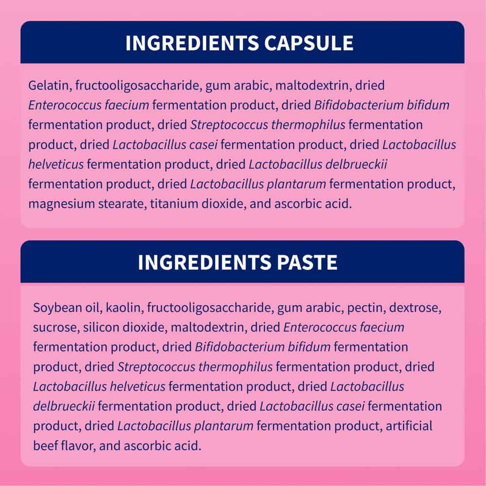 | Gelatin, fructooligosaccharide, gum arabic, dried Enterococcus faecium fermentation product, maltodextrin, dried Bifidobacterium bifidum fermentation product, dried Streptococcus thermophilus fermentation product, dried Lactobacillus helveticus fermentation product, dried Lactobacillus delbrueckii fermentation product, dried Lactobacillus casei fermentation product, dried Lactobacillus plantarum fermentation product, magnesium stearate, titanium dioxide, and ascorbic acid. |