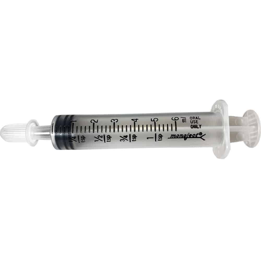 Monoject Oral Syringe helps you give your pet liquid medications. The single-use syringe has a clear barrel with graduated markings to make for easier and more accurate measurements of dosages. Provided measurements are in milliliters and teaspoons. Monoject Oral Syringe is available in a 3 ml and 6 ml syringe.