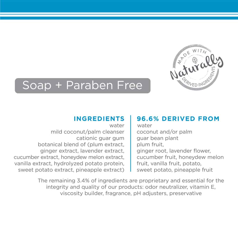 | Active Ingredients: Water, Mild Coconut/Palm Cleanser, Cationic Guar Gum, Botanical Blend Of (Plum Extract, Ginger Extract, Lavender Extract, Cucumber Extract, Honeydew Melon Extract, Vanilla Extract, Hydrolyzed Potato Protein, Sweet Potato Extract, Pineapple Extract), Odor Neutralizer, Vitamin E, Viscosity Builder, Fragrance, pH Adjusters, Preservative |