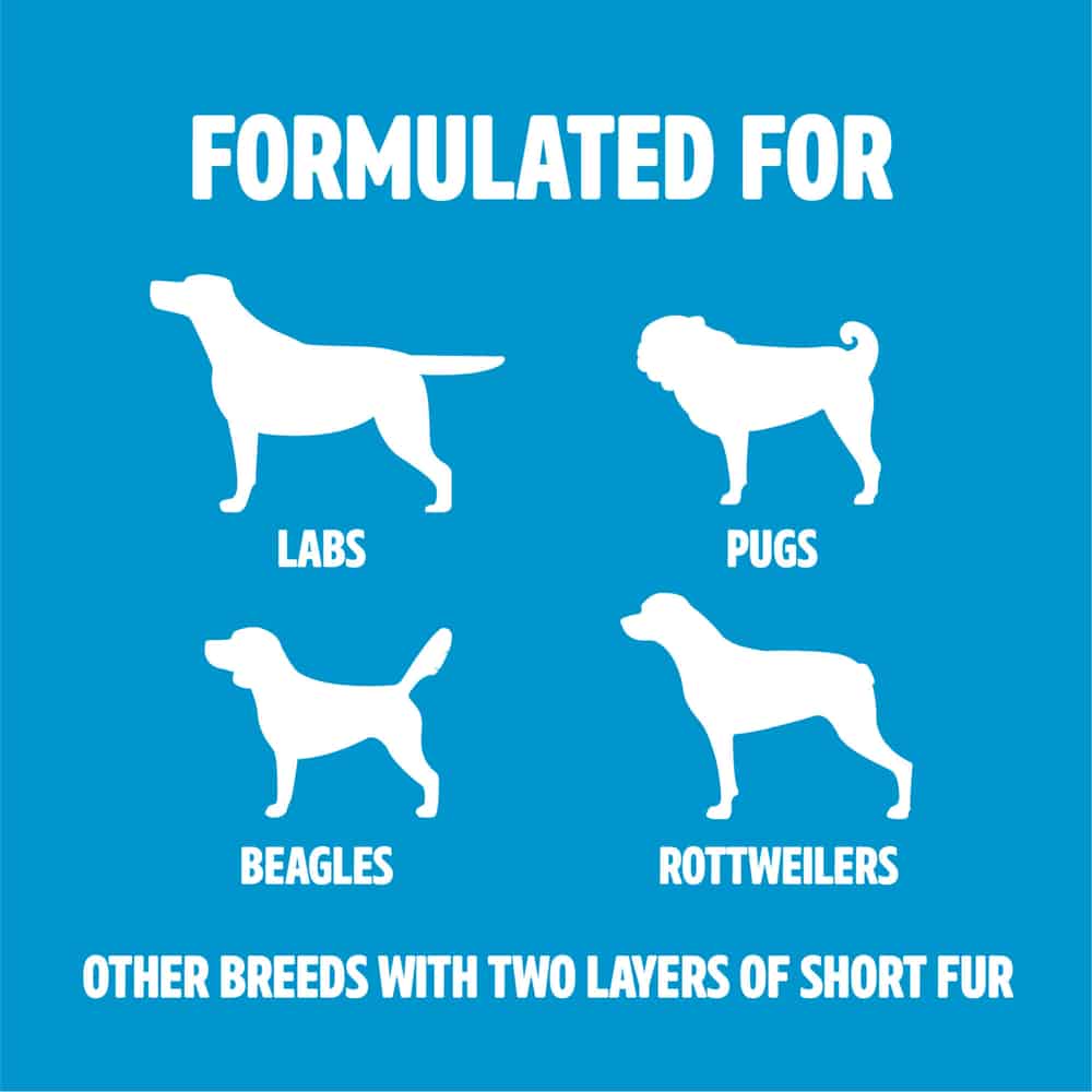 Shampoo for dogs who demand a double down on clean. Specially formulated for Labs, Pugs, Beagles, Rottweilers and other breeds with two layers of short fur