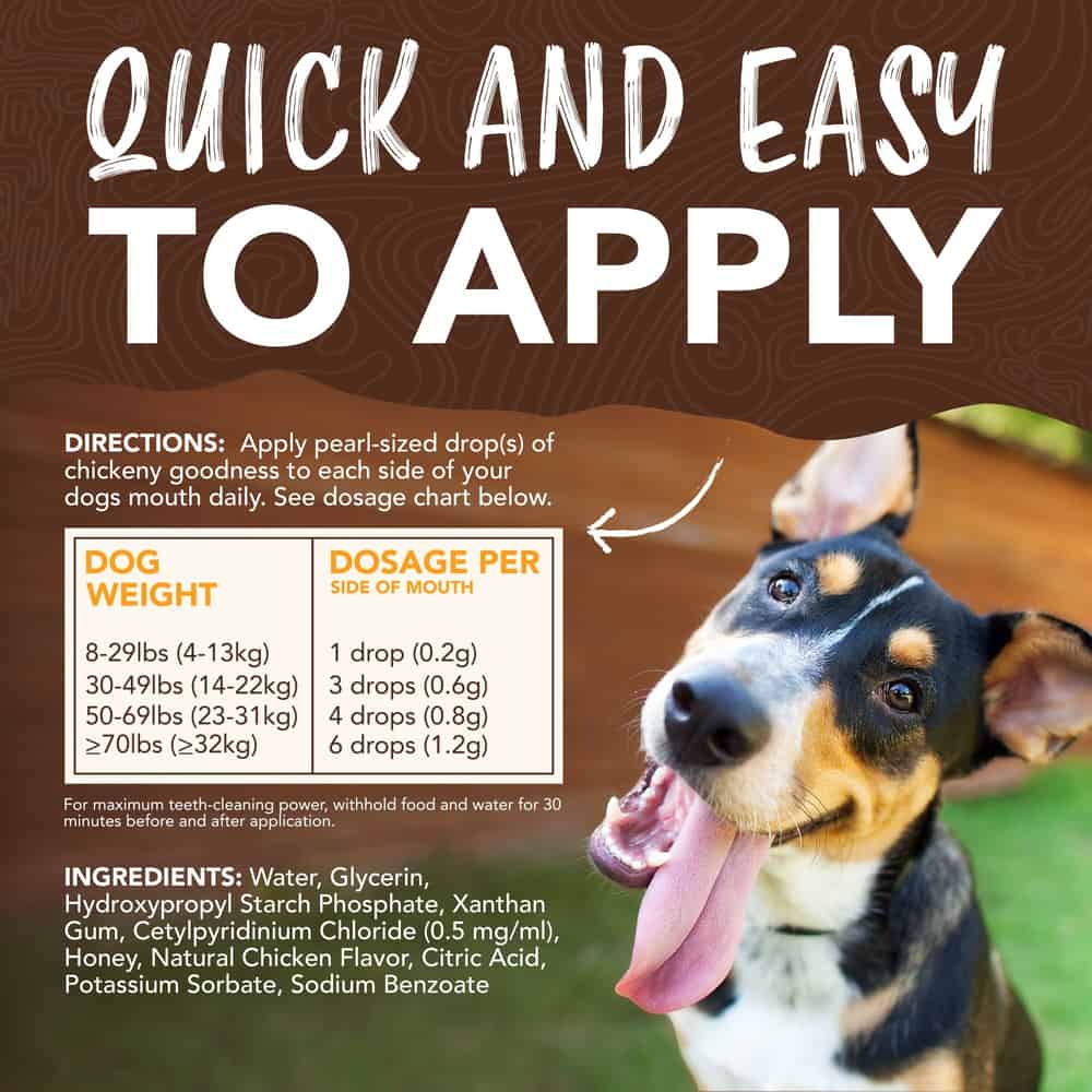- Apply pearl-sized drop(s) of chickeny goodness to each side of your dog's mouth daily (see dosage chart)