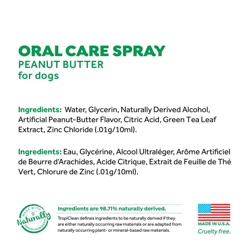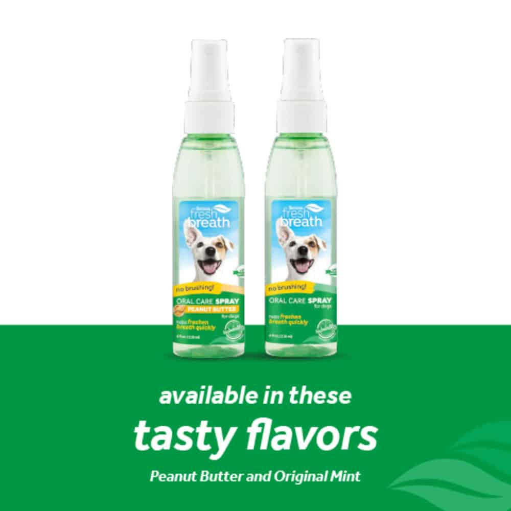 - TropiClean Fresh Breath Peanut Butter Flavor Oral Care Spray provides noticeably fresher breath in an easy-to-use spray. Formulated with green tea extract, oral care spray quickly freshens bad dog breath