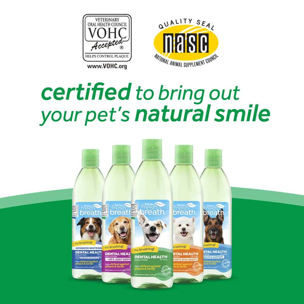 Formulated with a unique blend of ingredients for clean teeth and a healthy mouth. Goodbye dog breath, hello fresh breath! See fresher breath in 14 days or less with daily use as directed. Results may vary. Contains no added flavors, making it easy to incorporate into your dog's daily routine. Added probiotics, fructo-oligosaccharide and hemicellulose extract, promote a healthy gut. Establishing a daily oral care routine helps protect pets against the harmful side effects of periodontal disease, which can impact the liver, heart, and kidneys. Professional Certifications - TropiClean Fresh Breath Dental Health Solution Plus Digestive Support is accepted by the VOHC and NASC. For use in dogs only, 12 weeks and older. TropiClean Pet Products offers a full range of naturally derived dog and cat products including TropiClean Grooming Products, SPA by TropiClean, TropiClean OxyMed, TropiClean PerfectFur, TropiClean Enticers, and TropiClean Fresh Breath Oral Care and Dental Products. Contains one (1) 16oz bottle of TropiClean Fresh Breath Dental Health Solution Plus Digestive Support