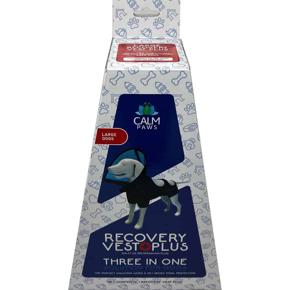 The Calm Paws Recovery Vest Plus Combines the reach of a recovery cone with the comfort and security of a recovery vest. Provides protection for post-surgery incisions, cuts, hot spots or insect bites on the pet. Ideal for spay & neuter and injuries/surgeries on legs. Cone has easy feed feature and can be removed from the vest, when the vest or collar alone is needed. Vest has unique easy secure strap that allows for adjustment based on girth of pets.