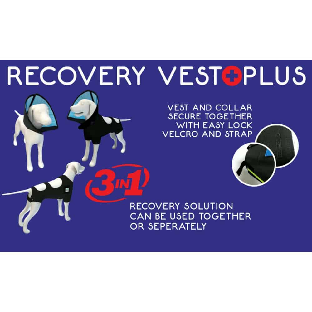 The Calm Paws Recovery Vest Plus Combines the reach of a recovery cone with the comfort and security of a recovery vest. Provides protection for post-surgery incisions, cuts, hot spots or insect bites on the pet. Ideal for spay & neuter and injuries/surgeries on legs. Cone has easy feed feature and can be removed from the vest, when the vest or collar alone is needed. Vest has unique easy secure strap that allows for adjustment based on girth of pets.