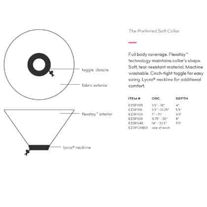 EZ Soft Collar is a lightweight, soft Elizabethan collar for dogs and cats. It provides full-body coverage to keep your pet from chewing or licking at an injury, hot spot, or recovery site. Flexstay technology maintains the collar's shape with an internal framework of plastic. Its Lycra neckline and easy-fit cinch-tight toggle closure provide a snug, comfortable fit. The soft, resistant material is machine washable. EZ Soft Collar is available in 5 different sizes.