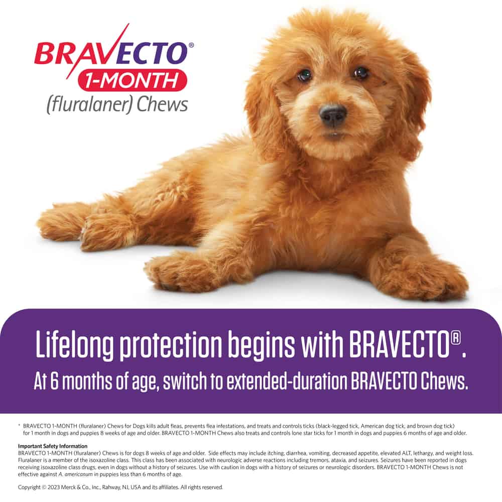 Bravecto 1-Month Chews kills adult fleas and is indicated for the treatment and prevention of flea infestations (Ctenocephalides felis), and the treatment and control of tick infestations [Ixodes scapularis (black-legged tick (a.k.a. deer tick)), Dermacentor variabilis (American dog tick), and Rhipicephalus sanguineus (brown dog tick)] for 1 month in dogs and puppies 8 weeks of age and older, and weighing 4.4 pounds or greater. Bravecto 1-Month Chews is also indicated for the treatment and control of Amblyomma americanum (lone star tick) infestations for 1 month in dogs and puppies 8 weeks of age and older, and weighing 4.4 pounds or greater.