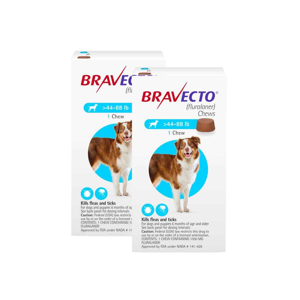 Bravecto Chews kills adult fleas and is indicated for the treatment and prevention of flea infestations (Ctenocephalides felis), and the treatment and control of tick infestations [Ixodes scapularis (black-legged tick (a.k.a. deer tick)), Dermacentor variabilis (American dog tick), and Rhipicephalus sanguineus (brown dog tick)] for 12 weeks in dogs and puppies 6 months of age and older, and weighing 4.4 pounds or greater. Bravecto Chews is also indicated for the treatment and control of Amblyomma americanum (lone star tick) infestations for 8 weeks in dogs and puppies 6 months of age and older, and weighing 4.4 pounds or greater.