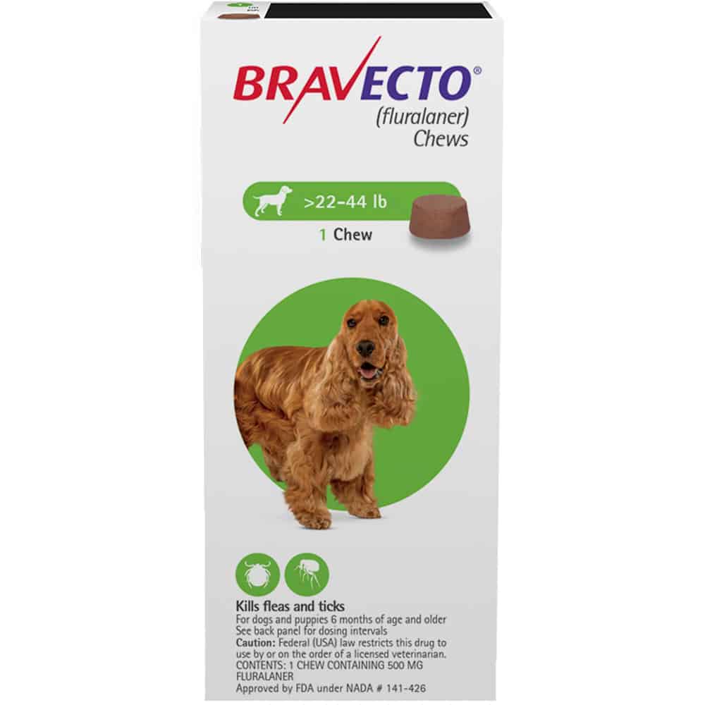 Bravecto Chews kills adult fleas and is indicated for the treatment and prevention of flea infestations (Ctenocephalides felis), and the treatment and control of tick infestations [Ixodes scapularis (black-legged tick (a.k.a. deer tick)), Dermacentor variabilis (American dog tick), and Rhipicephalus sanguineus (brown dog tick)] for 12 weeks in dogs and puppies 6 months of age and older, and weighing 4.4 pounds or greater. Bravecto Chews is also indicated for the treatment and control of Amblyomma americanum (lone star tick) infestations for 8 weeks in dogs and puppies 6 months of age and older, and weighing 4.4 pounds or greater.
