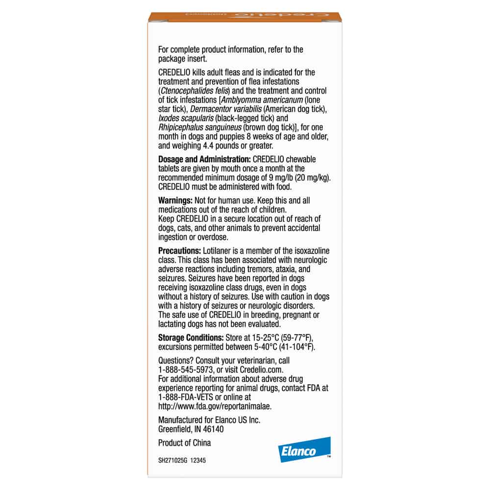 The safe use of Credelio (lotilaner) Tick & Flea Treatment + Flea Infestation Protection for Dogs in breeding, pregnant or lactating dogs hasn't been evaluated. Use with caution in dogs with a history of seizures. Credelio (lotilaner) Tick & Flea Treatment + Flea Infestation Protection for Dogs is only for oral use in dogs. See Credelio (lotilaner) Tick & Flea Treatment + Flea Infestation Protection for Dogs label for complete safety information.