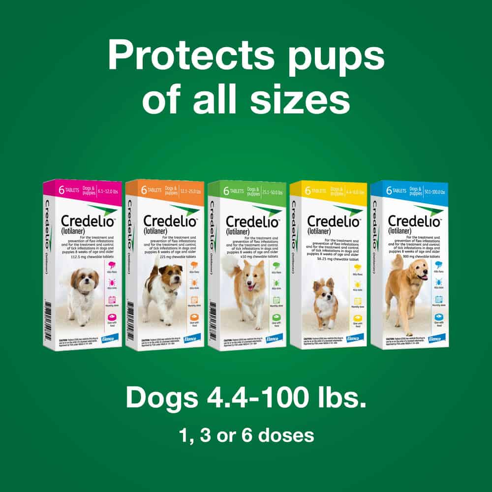 Credelio (lotilaner) Tick & Flea Treatment + Flea Infestation Protection for Dogs must be given with food or given within 30 minutes after feeding. It is meant for oral use only in dogs and puppies 8 weeks or older and weighing at least 4.4 lbs. Credelio (lotilaner) Tick & Flea Treatment + Flea Infestation Protection for Dogs requires a prescription from your veterinarian and is available for dogs and puppies 4.4-6.0 lbs (56.25 mg), 6.1-12.0 lbs (112.5 mg), 12.1-25.0 lbs (225 mg), 25.1-50.0 lbs (450 mg), and 50.1-100 lbs (900 mg).