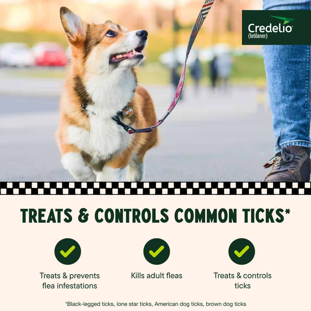 Credelio kills adult fleas and is indicated for the treatment and prevention of flea infestations. Credelio is also effective in the treatment and control of tick infestations (lone star tick, American dog tick, black-legged tick, and brown dog tick) for one month.