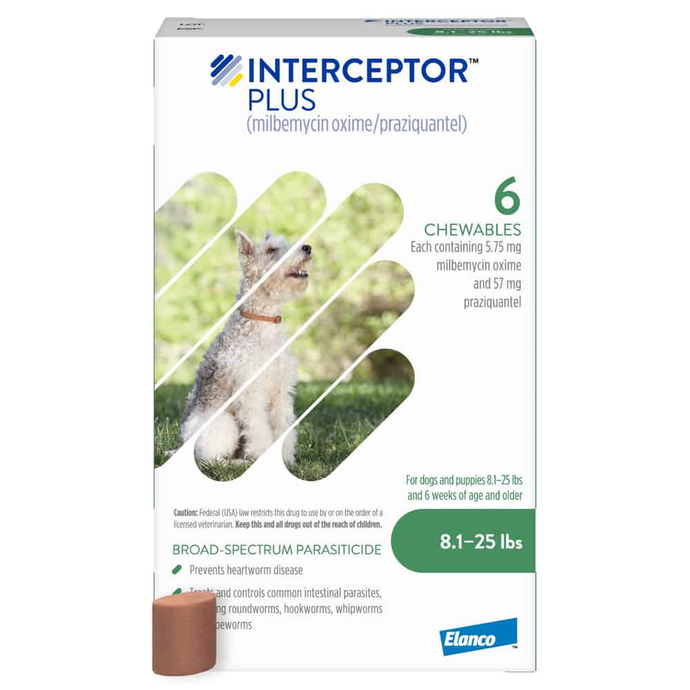 Interceptor Plus should be administered orally, once every month, at the minimum dosage of 0.23 mg/lb (0.5 mg/kg) milbemycin oxime, and 2.28 mg/lb (5 mg/kg) praziquantel. For heartworm prevention, give once monthly for at least 6 months after exposure. Dogs weighing 2-8 lbs should be given one Interceptor Plus chewable tablet (Orange Box) monthly. Dogs weighing 8.1-25 lbs should be given one Interceptor Plus chewable tablet (Green Box) monthly. Dogs weighing 25.1-50 lbs should be given one Interceptor Plus chewable tablet (Yellow Box) monthly. Dogs weighing 50.1-100 lbs should be given one Interceptor Plus chewable tablet (Blue Box) monthly.