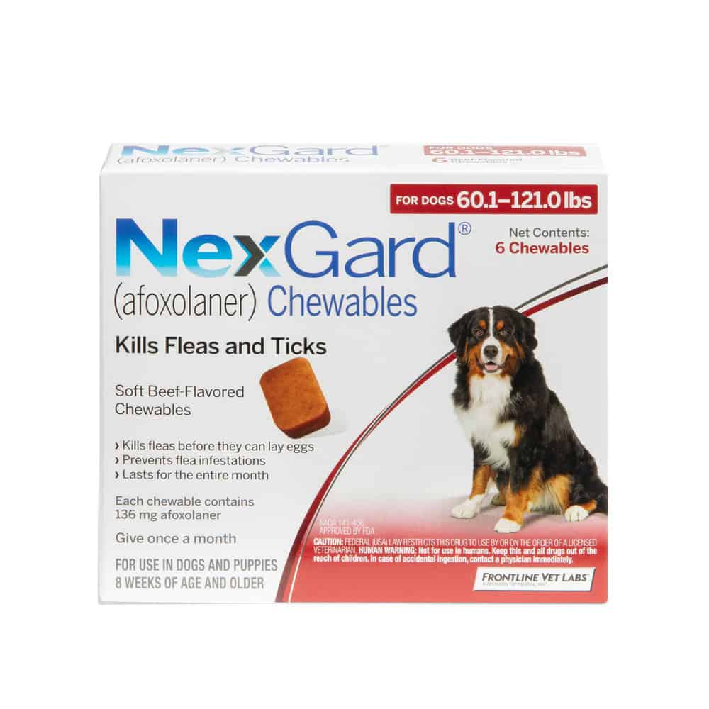 NexGard Chewables active ingredient Afoxolaner is used to kill adult fleas and are indicated as an effective drug dosage for the oral treatment and prevention of flea infestations (Ctenocephalides felis), and the treatment and control of many types of ticks, including the American dog tick (Dermacentor variabilis), black-legged (deer) tick (Ixodes scapularis) and Lone star tick (Amblyomma americanum) infestations in dogs and puppies 8 weeks of age and older, weighing 4 pounds of body weight or greater, for one month.