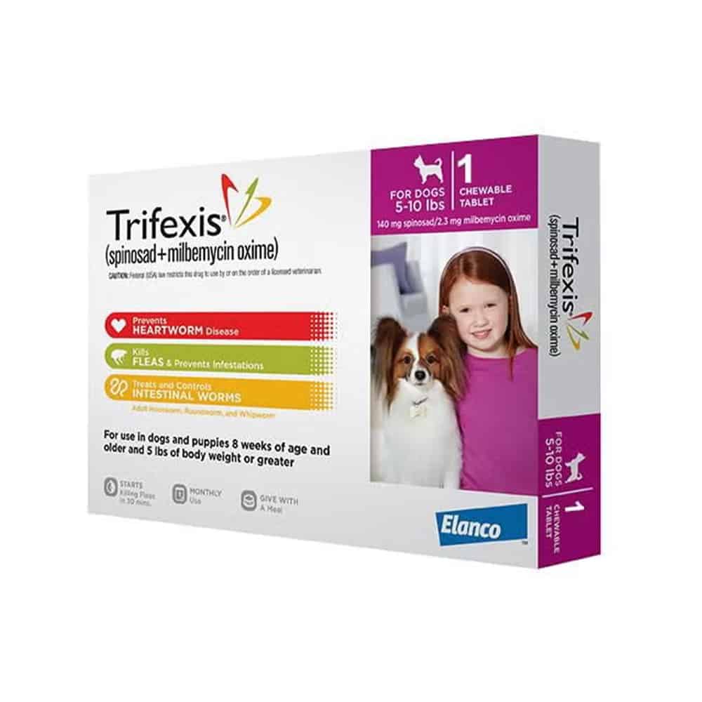 Trifexis is a prescription medication FDA approved for use in dogs 8 weeks of age or older and 5 lbs of body weight or more. Trifexis contains spinosad and milbemycin oxime and is indicated for the prevention of heartworm disease. Trifexis kills fleas and is indicated for the prevention and treatment of flea infestations, and the treatment and control of adult hookworm, adult roundworm, and adult whipworm infections. Trifexis is available in a Pink box for dogs 5 to 10 lbs (140 mg/2.3 mg), Orange box for dogs 10.1 to 20 lbs (270 mg/4.5 mg), Green box for dogs 20.1 to 40 lbs (560 mg/9.3 mg), Blue box for dogs 40.1 to 60 lbs (810 mg/13.5 mg), and Brown box for dogs 60.1 to 120 lbs (1620 mg/27 mg). For dogs over 120 lbs, give the appropriate combination of tablets.