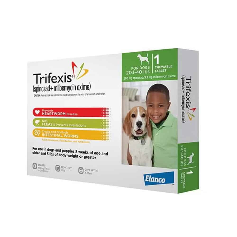 Trifexis is a prescription medication FDA approved for use in dogs 8 weeks of age or older and 5 lbs of body weight or more. Trifexis contains spinosad and milbemycin oxime and is indicated for the prevention of heartworm disease. Trifexis kills fleas and is indicated for the prevention and treatment of flea infestations, and the treatment and control of adult hookworm, adult roundworm, and adult whipworm infections. Trifexis is available in a Pink box for dogs 5 to 10 lbs (140 mg/2.3 mg), Orange box for dogs 10.1 to 20 lbs (270 mg/4.5 mg), Green box for dogs 20.1 to 40 lbs (560 mg/9.3 mg), Blue box for dogs 40.1 to 60 lbs (810 mg/13.5 mg), and Brown box for dogs 60.1 to 120 lbs (1620 mg/27 mg). For dogs over 120 lbs, give the appropriate combination of tablets.