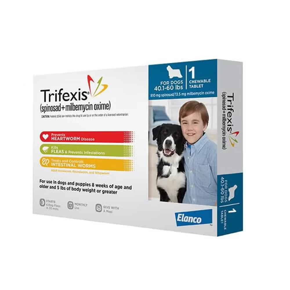 Trifexis is a prescription medication FDA approved for use in dogs 8 weeks of age or older and 5 lbs of body weight or more. Trifexis contains spinosad and milbemycin oxime and is indicated for the prevention of heartworm disease. Trifexis kills fleas and is indicated for the prevention and treatment of flea infestations, and the treatment and control of adult hookworm, adult roundworm, and adult whipworm infections. Trifexis is available in a Pink box for dogs 5 to 10 lbs (140 mg/2.3 mg), Orange box for dogs 10.1 to 20 lbs (270 mg/4.5 mg), Green box for dogs 20.1 to 40 lbs (560 mg/9.3 mg), Blue box for dogs 40.1 to 60 lbs (810 mg/13.5 mg), and Brown box for dogs 60.1 to 120 lbs (1620 mg/27 mg). For dogs over 120 lbs, give the appropriate combination of tablets.