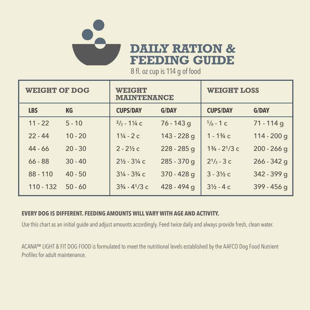 Acana Light & Fit Recipe Grain-Free Adult Dry Dog Food Dosage: