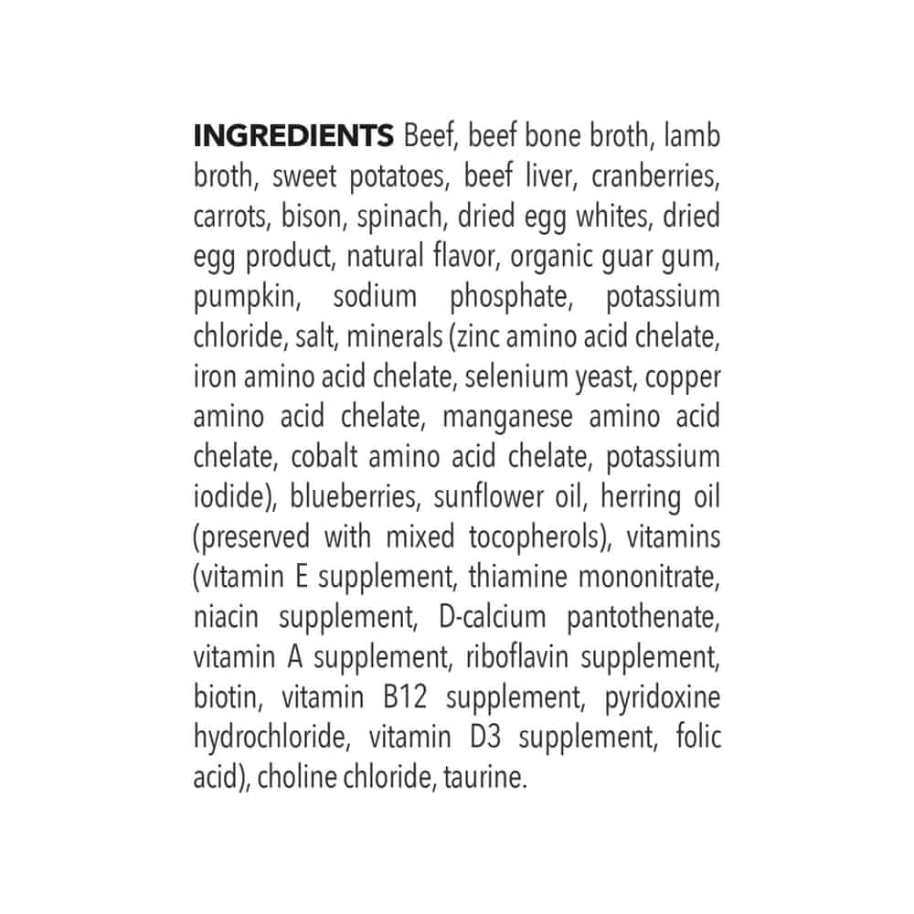 | Beef, beef bone broth, lamb broth, sweet potatoes, beef liver, cranberries, carrots, bison, spinach, dried egg whites, dried egg product, Natural flavor, organic guar gum, pumpkin, sodium phosphate, potassium chloride, salt, minerals (zinc amino acid chelate, iron amino acid chelate, selenium yeast, copper amino acid chelate, manganese amino acid chelate, cobalt amino acid chelate, potassium iodide), blueberries, sunflower oil, herring oil (preserved with mixed tocopherols), vitamins (vitamin E supplement, thiamine mononitrate, niacin supplement, D-calcium pantothenate, vitamin A supplement, riboflavin supplement, biotin, vitamin B12 supplement, pyridoxine hydrochloride, vitamin D3 supplement, folic acid), choline chloride, taurine. |
