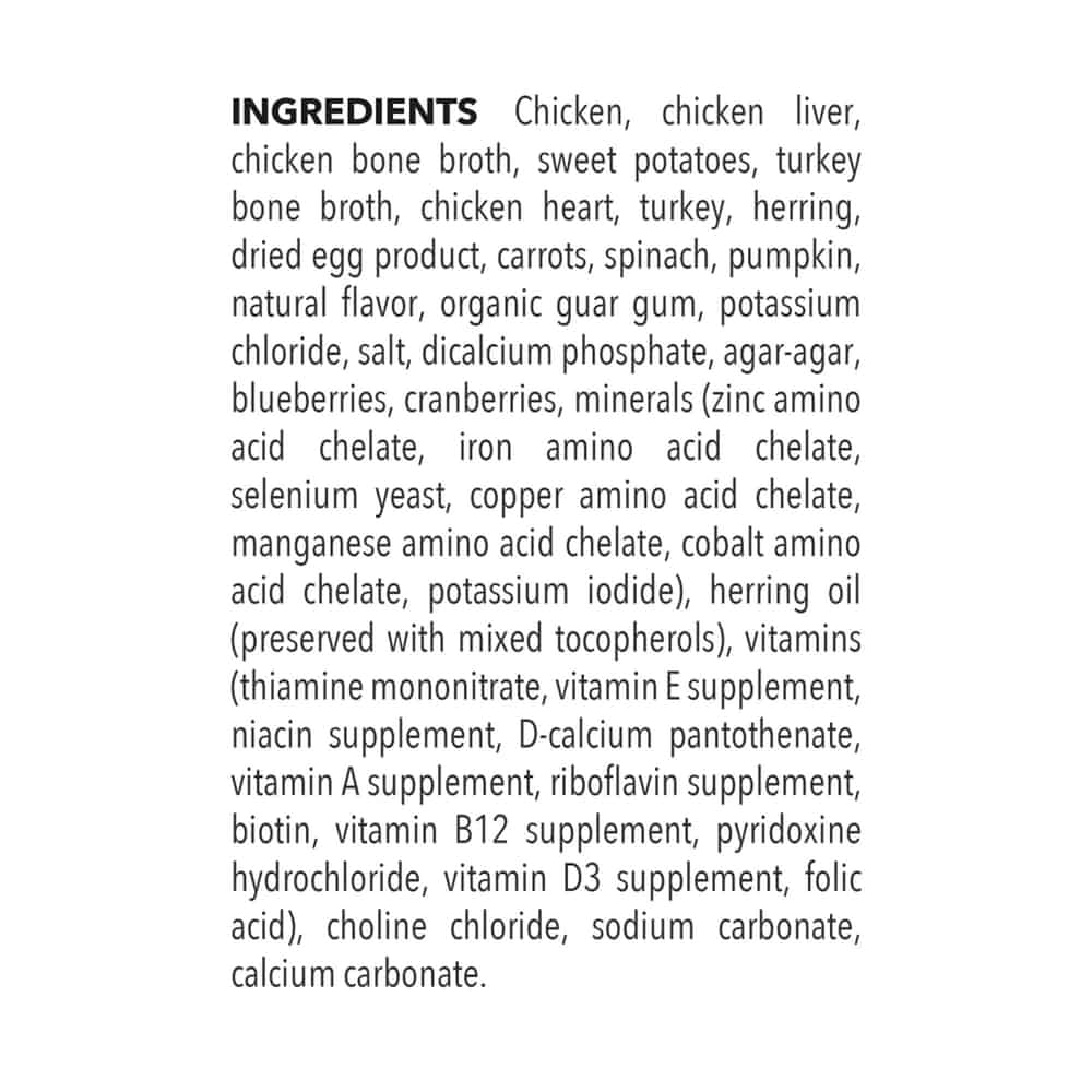 | Chicken, chicken liver, chicken bone broth, sweet potatoes, turkey bone broth, chicken heart, turkey, herring, dried egg product, carrots, spinach, pumpkin, Natural flavor, organic guar gum, potassium chloride, salt, dicalcium phosphate, agar-agar, blueberries, cranberries, minerals (zinc amino acid chelate, iron amino acid chelate, selenium yeast, copper amino acid chelate, manganese amino acid chelate, cobalt amino acid chelate, potassium iodide), herring oil (preserved with mixed tocopherols), vitamins (thiamine mononitrate, vitamin E supplement, niacin supplement, D-calcium pantothenate, vitamin A supplement, riboflavin supplement, biotin, vitamin B12 supplement, pyridoxine hydrochloride, vitamin D3 supplement, folic acid), choline chloride, sodium carbonate, calcium carbonate. |