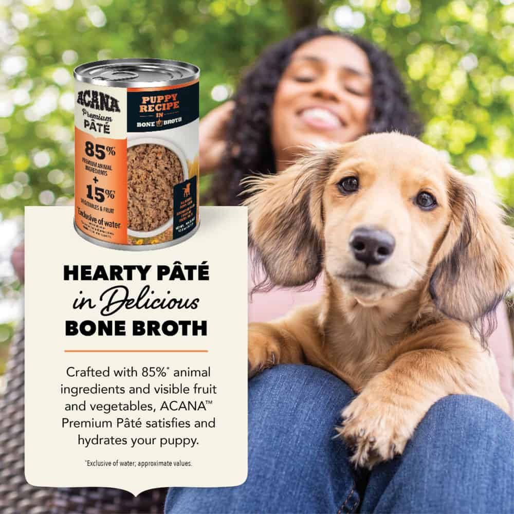 - ACANA Premium Chunks wet dog food for puppies are stewed in a delicious, nutritious, & savory bone broth for taste and nutrition dogs will love.