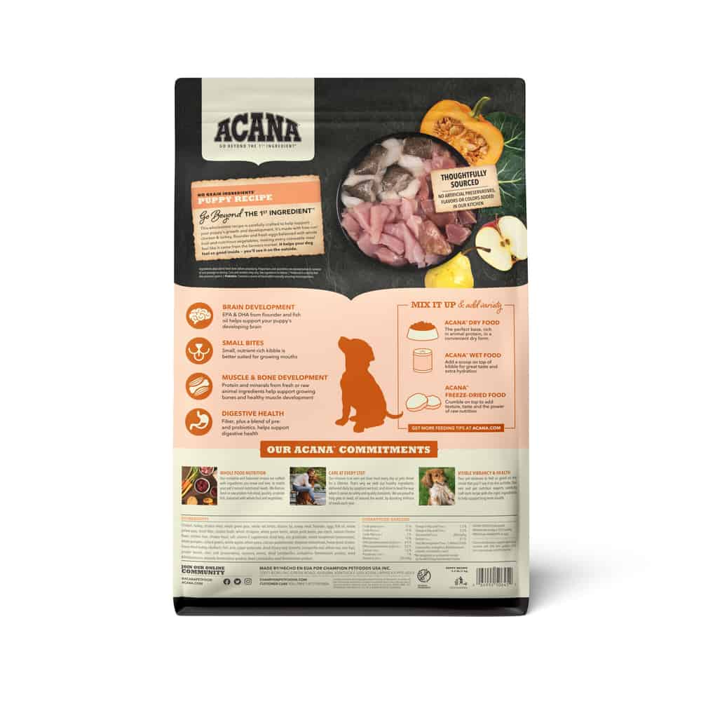 - ACANA balances protein-rich animal ingredients with wholesome fruits, vegetables and nutrients with the protein and fat puppies need for development, while EPA & DHA from flounder and fish oil helps support your puppy’s developing brain