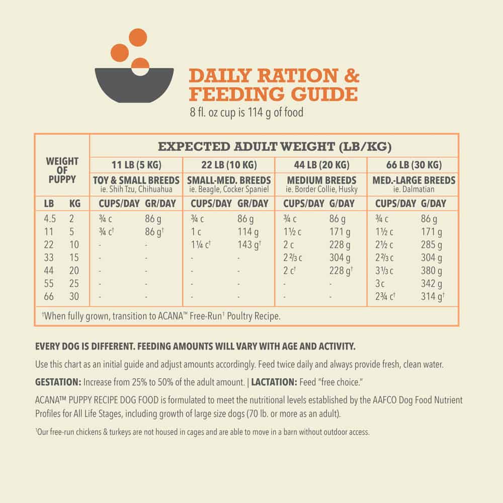 Acana Puppy Recipe Grain-Free Dry Dog Food Dosage:
