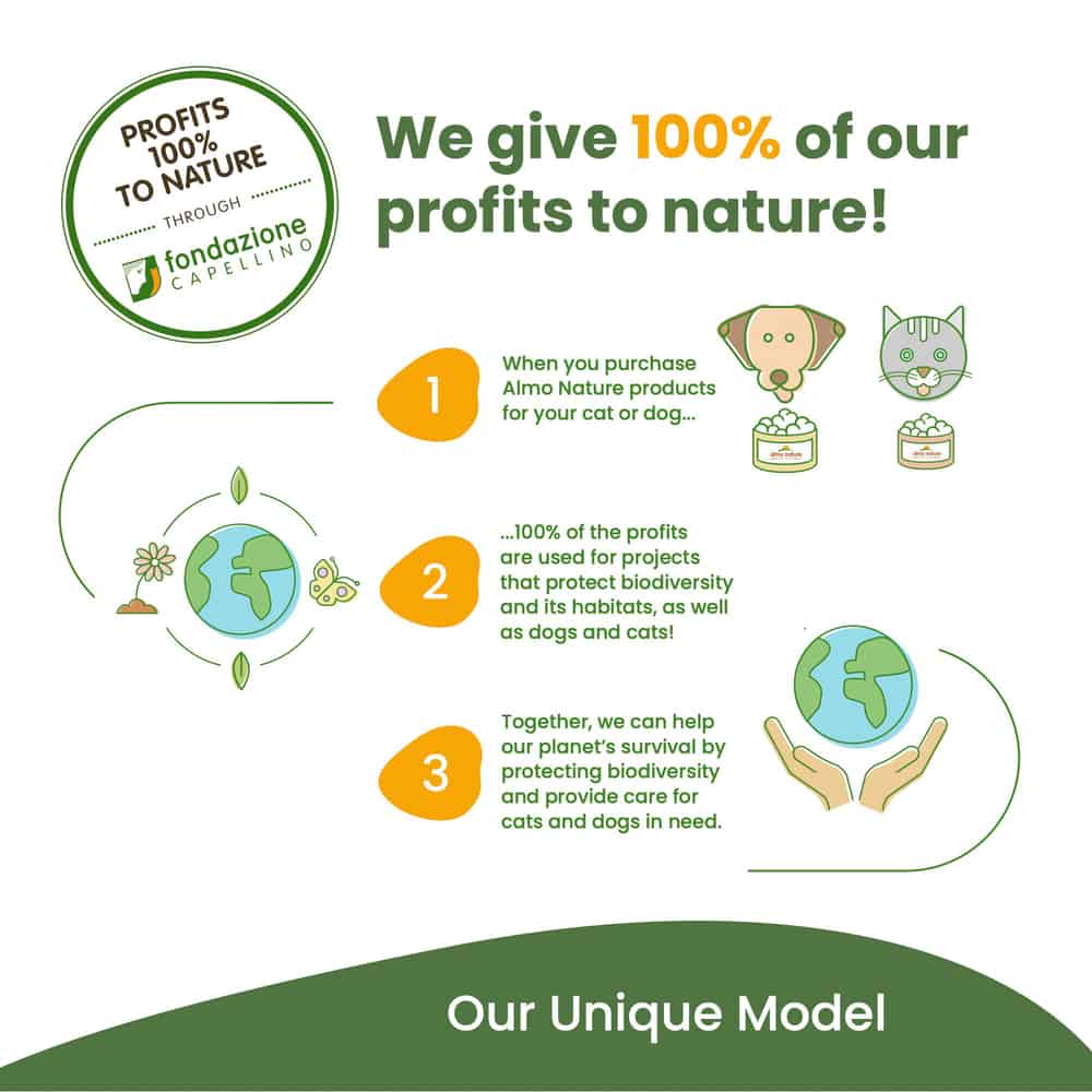 - 100% of the revenue from the sale of Almo Nature products (after expenses and taxes) is allocated to biodiversity restoration.