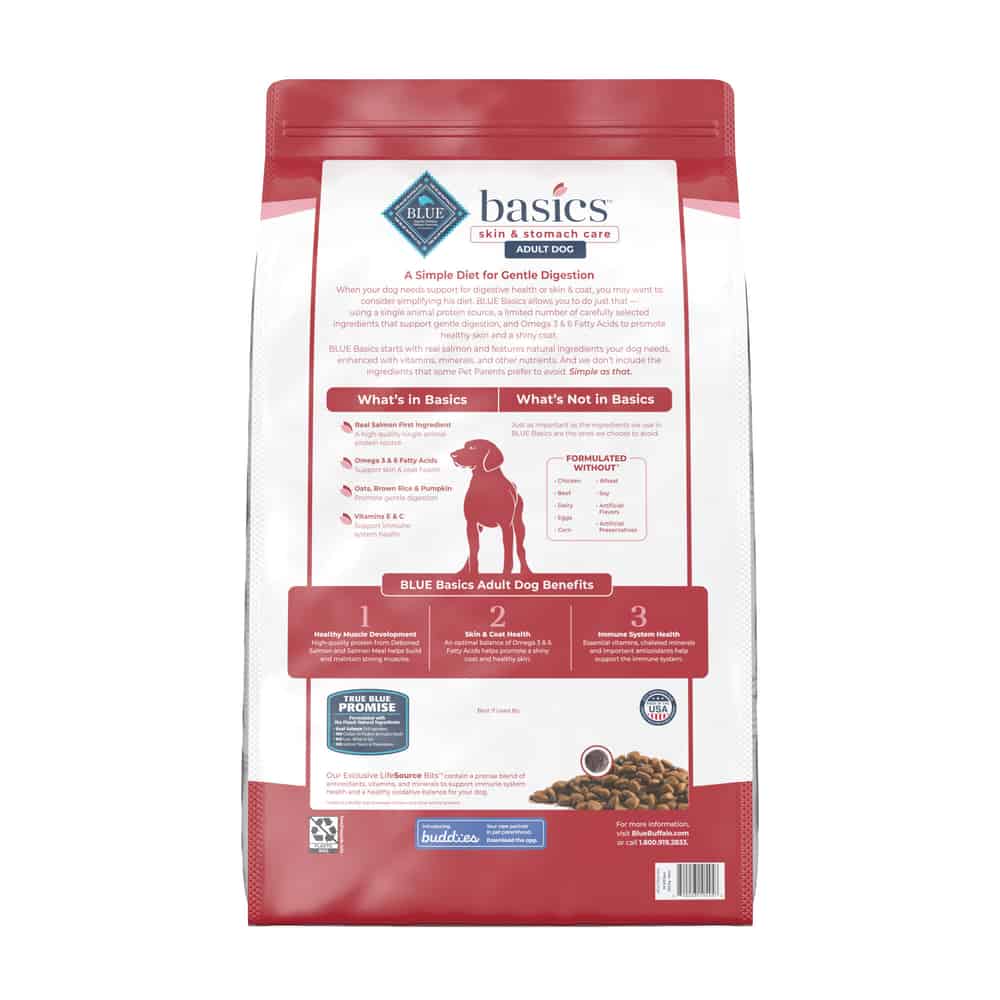 BLUE Basics Salmon and Potato Recipe is a limited-ingredient diet formulated for dogs with food sensitivities.