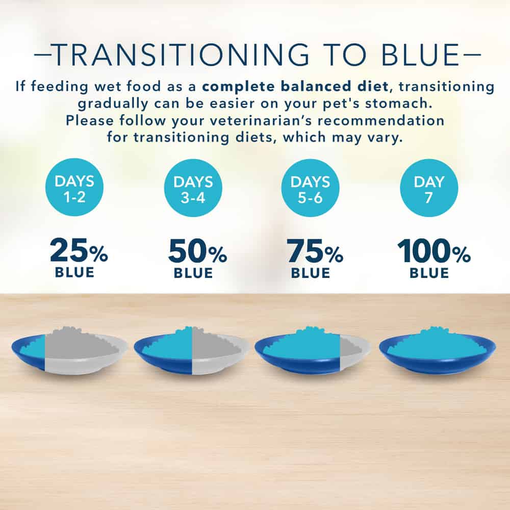 Transition Dog Food Gradually: Start by mixing 25% of BLUE with your dog's old food, and gradually increase the proportion of BLUE over the next 7 days.