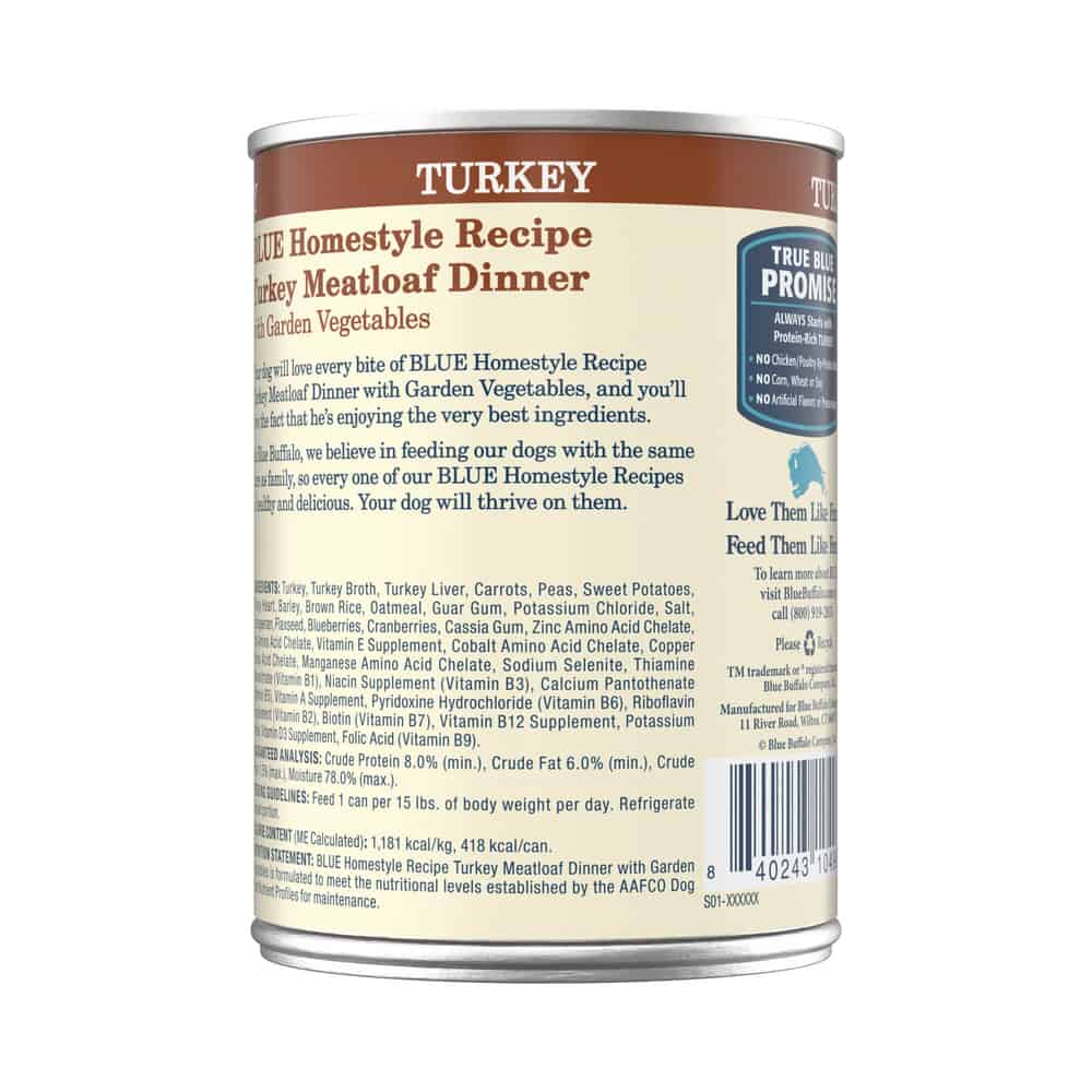 BLUE Homestyle Recipe Turkey Meatloaf Dinner provides your dog with delicious, high-quality turkey, wholesome whole grains and garden fruits and vegetables including carrots, sweet potatoes, blueberries and cranberries.