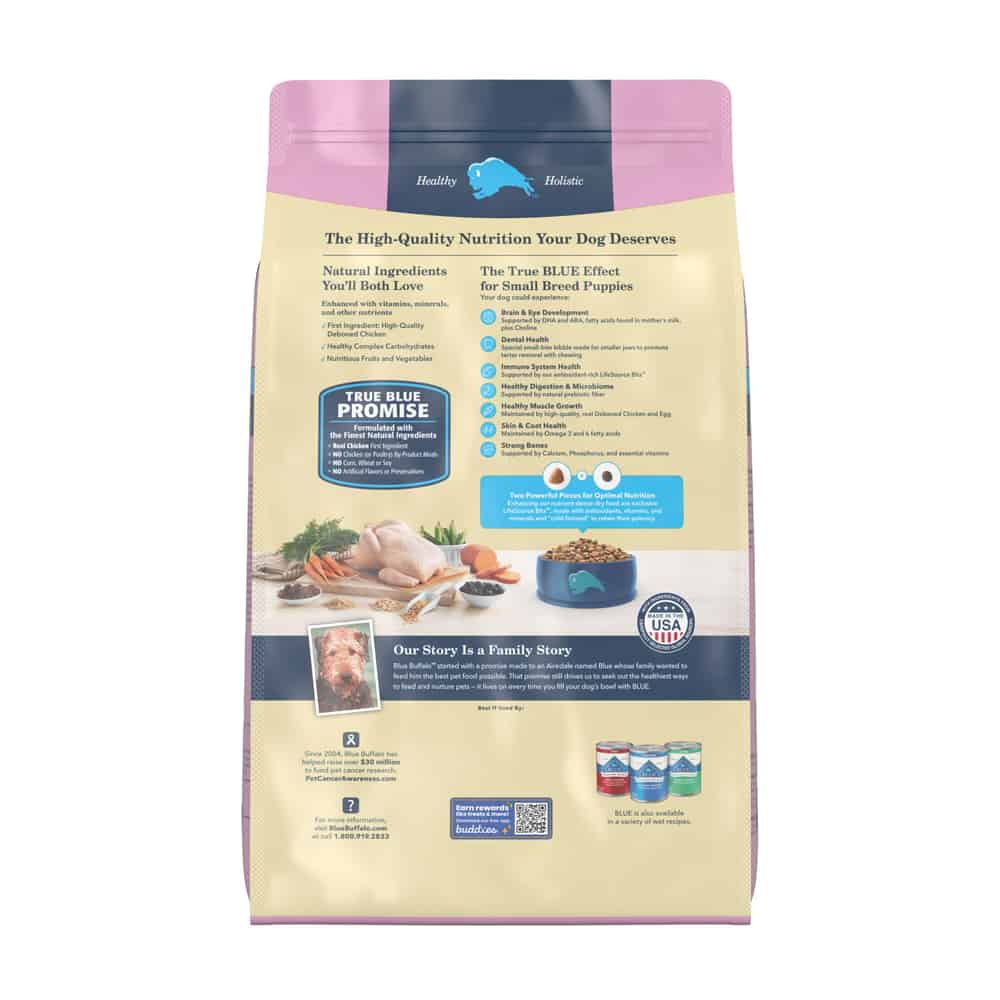 BLUE Life Protection Formula starts with high-quality deboned chicken and features wholesome whole grains, antioxidant-rich fruits and veggies, plus essential nutrients like DHA to support healthy growth and development in small puppies.