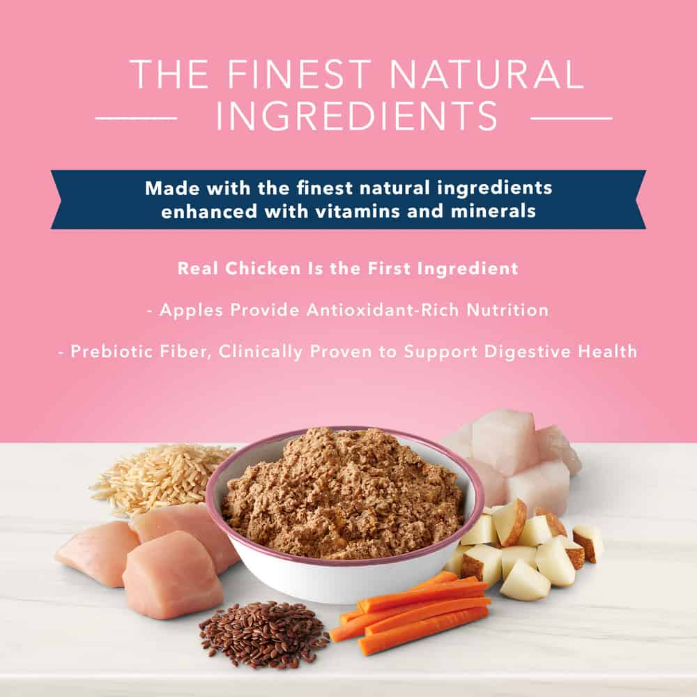| Chicken, Chicken Broth, Whitefish, Chicken Liver, Potatoes, Pea Flour, Pea Protein, Natural Flavor, Dried Plain Beet Pulp, Oatmeal, Brown Rice, Barley, Flaxseed, Carrageenan, Apples, Carrots, Peas, Potassium Chloride, Guar Gum, Fructooligocaccharide, Salt, DL-Methionine, Choline Chloride, Vitamin E Supplement, Calcium Carbonate, L-Ascorbyl-2-Polyphosphate (source of Vitamin C), Zinc Amino Acid Chelate, Iron Amino Acid Chelate, Thiamine Mononitrate (Vitamin B1), Copper Amino Acid Chelate, Manganese Amino Acid Chelate, Sodium Selenite, Cobalt Amino Acid Chelate, Niacin Supplement (Vitamin B3), Calcium Pantothenate (Vitamin B5), Vitamin A Supplement, Riboflavin Supplement (Vitamin B2), Biotin (Vitamin B7), Vitamin B12 Supplement, Potassium Iodide, Pyridoxine Hydrochloride (Vitamin B6), Vitamin D3 Supplement, Folic Acid (Vitamin B9). |