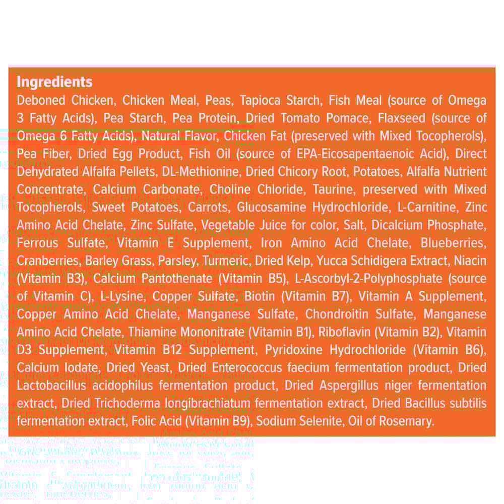 | Ingredients: Deboned Chicken, Chicken Meal, Dried Chicken, Oatmeal, Barley, Brown Rice, Potatoes, Salmon Meal (source of Omega 3 Fatty Acids), Dried Tomato Pomace, Flaxseed (source of Omega 6 Fatty Acids), Natural Flavor, Chicken Fat (preserved with Mixed Tocopherols), Fish Oil (source of EPA-Eicosapentaenoic Acid), Direct Dehydrated Alfalfa Pellets, L-Threonine, Calcium Carbonate, Dried Chicory Root, Alfalfa Nutrient Concentrate, DL-Methionine, Salt, Potassium Chloride, Choline Chloride, Vitamin E Supplement, preserved with Mixed Tocopherols, Taurine, Sweet Potatoes, Carrots, Glucosamine Hydrochloride, L-Carnitine, Zinc Amino Acid Chelate, Zinc Sulfate, Vegetable Juice for color, Ferrous Sulfate, Iron Amino Acid Chelate, Blueberries, Cranberries, Barley Grass, Parsley, Turmeric, Dried Kelp, Yucca Schidigera Extract, Niacin (Vitamin B3), Calcium Pantothenate (Vitamin B5), Copper Sulfate, Biotin (Vitamin B7), L-Ascorbyl-2-Polyphosphate (source of Vitamin C), L-Lysine, Vitamin A Supplement, Copper Amino Acid Chelate, Manganese Sulfate, Manganese Amino Acid Chelate, Chondroitin Sulfate, Thiamine Mononitrate (Vitamin B1), Riboflavin (Vitamin B2), Vitamin D3 Supplement, Vitamin B12 Supplement, Pyridoxine Hydrochloride (Vitamin B6), Calcium Iodate, Dried Yeast, Dried Enterococcus faecium fermentation product, Dried Lactobacillus acidophilus fermentation product, Dried Aspergillus niger fermentation extract, Dried Trichoderma longibrachiatum fermentation extract, Dried Bacillus subtilis fermentation extract, Folic Acid (Vitamin B9), Sodium Selenite, Oil of Rosemary. | |