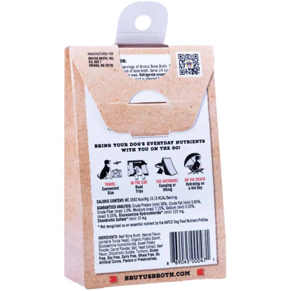 Traveling? Hiking? Out on the town? No worries – pet owners can take Brutus Broth and its countless benefits with them and their pet wherever their adventures might take them! Brutus on the Go is a convenient travel-sized, powdered version of the original human-grade Brutus Bone Broth. Brutus on the Go Beef Bone Broth is fortified with veterinarian-recommended servings of supplemental glucosamine and chondroitin for hip and joint health, and turmeric, a powerhouse superfood. Because bone broth for humans is not safe for pets (due to toxic ingredients and high sodium), Brutus spent years developing their nourishing superfood formula that pet owners can feel great about and that their pets will love. The amino acids, nutrients, and naturally-occurring collagen found in bone broth can help to improve digestion and chronic digestive disorders, promote healthy skin, hair, teeth, and nails, support mobility, and can help boost energy levels. Bone broth is great for pups on the go because it is an effective source of hydration after active days and can encourage proper eating among dogs who might be experiencing travel-related anxiety.