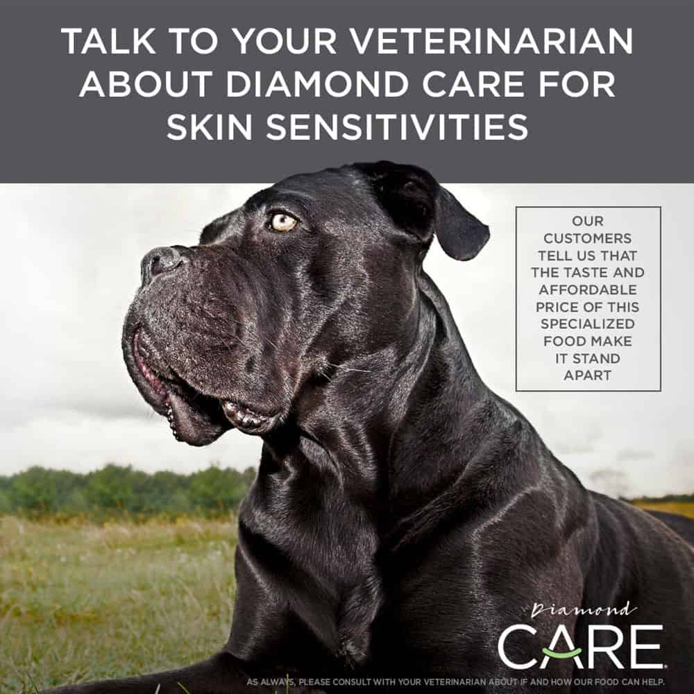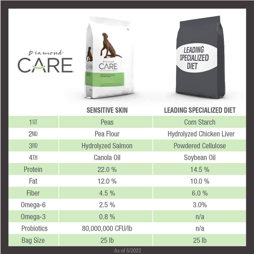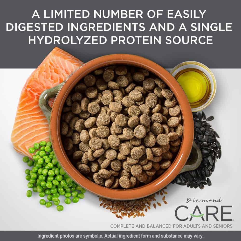 If your dog has skin sensitivities, Diamond CARE Sensitive Skin Formula for Adult Dogs may be the diet for you. For starters, hydrolyzed salmon is the single animal protein source. This specialized diet is rounded out with a limited number of select ingredients.
