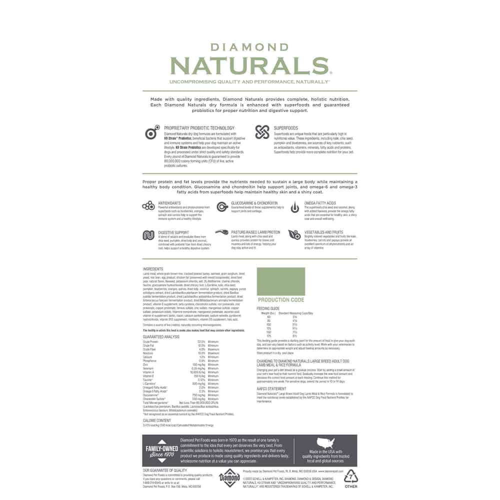 | Diamond Naturals Large Breed Adult Dog Lamb Meal & Rice Formula is formulated to meet the nutritional levels established by the AAFCO Dog Food Nutrient Profiles for maintenance. |