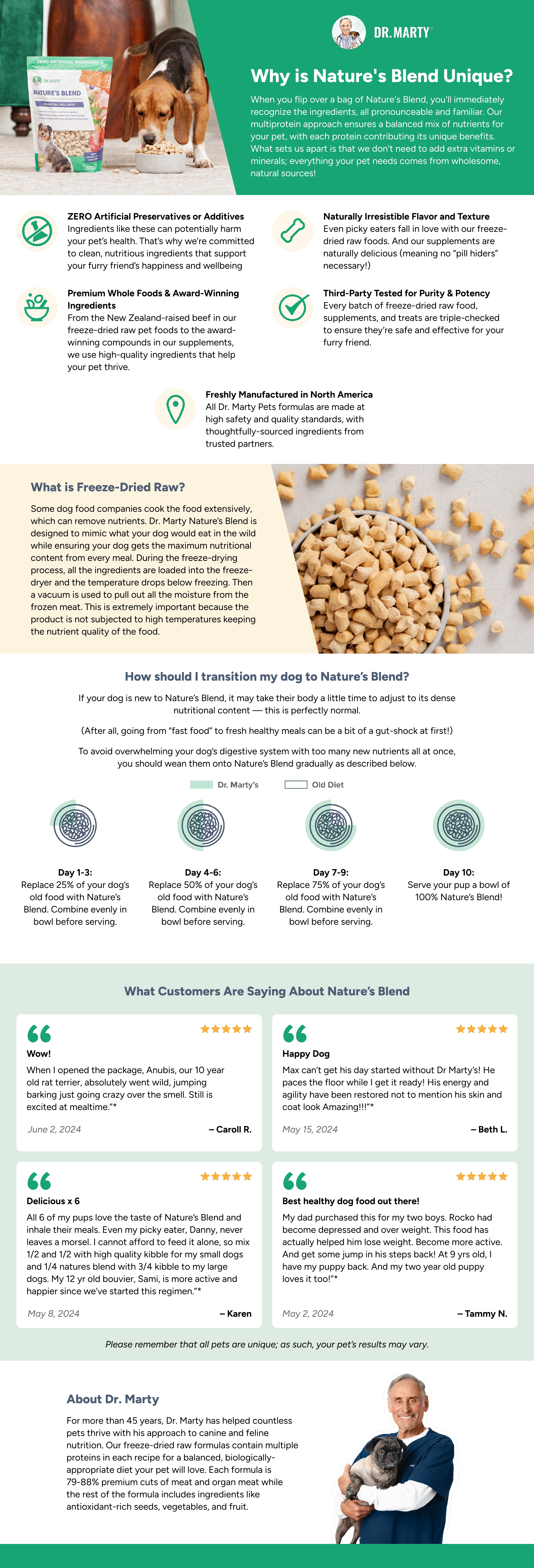- How should I transition my dog to Nature's Blend: If your dog is new to Nature's Blend, it may take their body a little time to adjust to its dense nutritional content - this is perfectly normal. (After all, going from "fast food" to fresh healthy meals can be a bit of a gut-shock at first!) To avoid overwhelming your dog's digestive system with too many new nutrients all at once, you should wean them onto Nature's Blend gradually as described below.