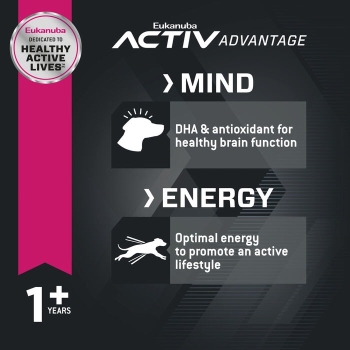 Animal proteins, glucosamine, and chondroitin sulfate help keep muscles lean and joints limber and strong. DHA and vitamin E help support healthy brain function to help your dog stay sharp. Optimal levels of fats and carbohydrates help fuel an active lifestyle. 3D DentaDefense reduces tartar buildup for clean teeth and healthy gums. And a natural fiber and prebiotic blend aids gentle digestion to help keep your dog feeling healthy. And high-quality lamb is the first ingredient to power your active dog’s day. Pair this kibble with Eukanuba Adult wet dog food for the perfect complement.