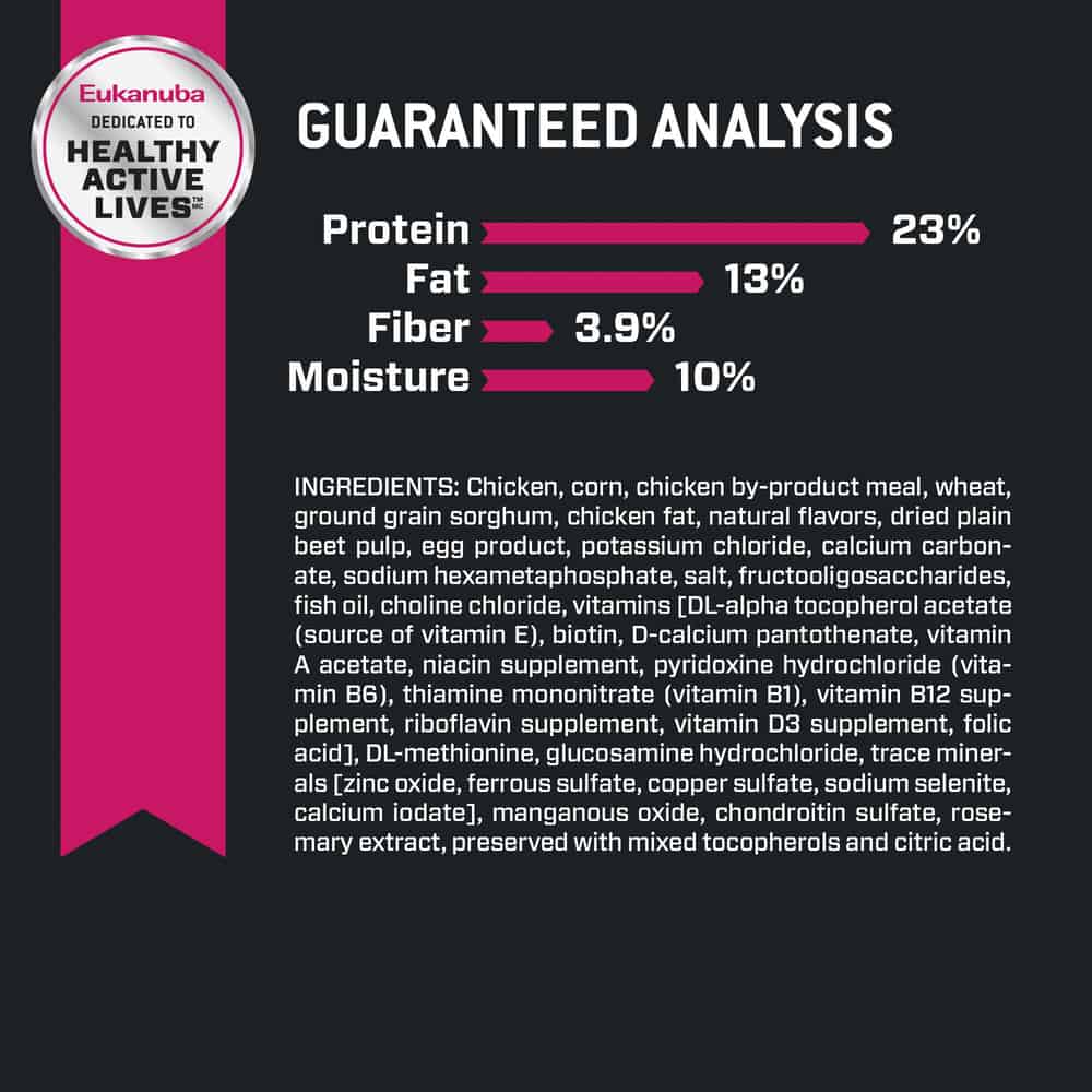 | Ingredients:Chicken, corn, chicken by-product meal, wheat, ground grain sorghum, chicken fat, natural flavors, dried plain beet pulp, egg product, potassium chloride, calcium carbonate, sodium hexametaphosphate, salt, fructooligosaccharides, fish oil, choline chloride, vitamins [DL-alpha tocopherol acetate (source of vitamin E), biotin, D-calcium pantothenate, vitamin A acetate, niacin supplement, pyridoxine hydrochloride (vitamin B6), thiamine mononitrate (vitamin B1), vitamin B12 supplement, riboflavin supplement, vitamin D3 supplement, folic acid], DL-methionine, glucosamine hydrochloride, trace minerals [zinc oxide, ferrous sulfate, copper sulfate, sodium selenite, calcium iodate], magnesium oxide, chondroitin sulfate, rosemary extract, preserved with mixed tocopherols and citric acid. | |