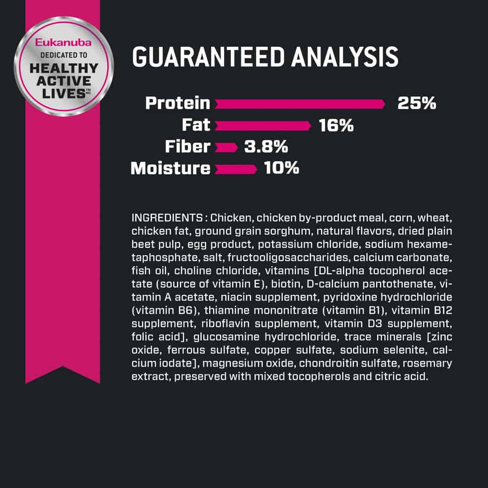 | Chicken, chicken by-product meal, corn, wheat, chicken fat, ground grain sorghum, natural flavors, dried plain beet pulp, egg product, potassium chloride, sodium hexametaphosphate, salt, fructooligosaccharides, calcium carbonate, fish oil, choline chloride, vitamins [DL-alpha tocopherol acetate (source of vitamin E), biotin, D-calcium pantothenate, vitamin A acetate, niacin supplement, pyridoxine hydrochloride (vitamin B6), thiamine mononitrate (vitamin B1), vitamin B12 supplement, riboflavin supplement, vitamin D3 supplement, folic acid], glucosamine hydrochloride, trace minerals [zinc oxide, ferrous sulfate, copper sulfate, sodium selenite, calcium iodate], magnesium oxide, chondroitin sulfate, rosemary extract, preserved with mixed tocopherols and citric acid. |