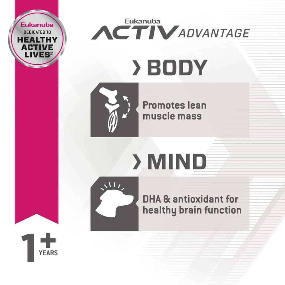 - Helps promote a lean, active body with L-carnitine, 39% less fat (vs. Eukanuba Adult Medium Breed dry dog food), and an adapted blend of carbohydrates