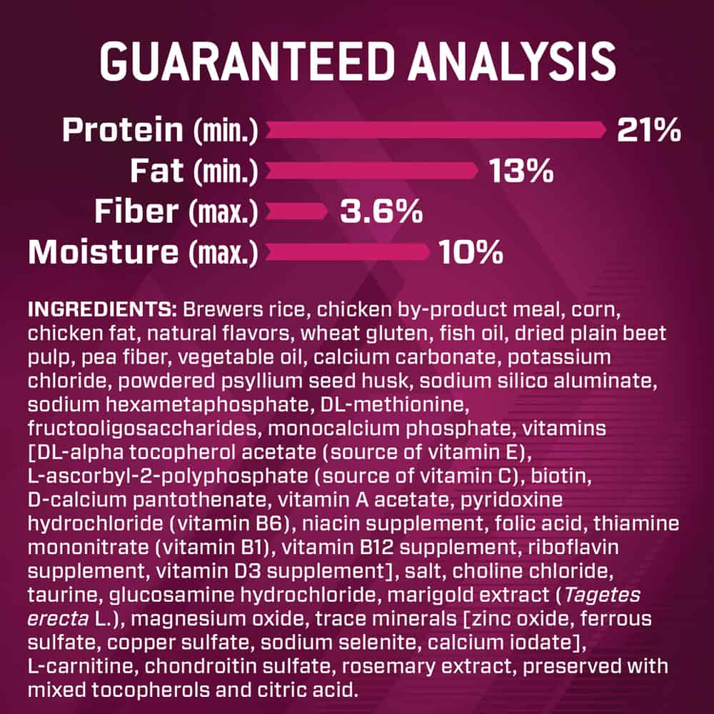 | Brewers rice, chicken by-product meal, corn, chicken fat, natural flavors, wheat gluten, fish oil, dried plain beet pulp, pea fiber, vegetable oil, calcium carbonate, potassium chloride, powdered psyllium seed husk, sodium silico aluminate, sodium hexametaphosphate, DL-methionine, fructooligosaccharides, monocalcium phosphate, vitamins [DL-alpha tocopherol acetate (source of vitamin E), L-ascorbyl-2-polyphosphate (source of vitamin C), biotin, D-calcium pantothenate, vitamin A acetate, pyridoxine hydrochloride (vitamin B6), niacin supplement, folic acid, thiamine mononitrate (vitamin B1), vitamin B12 supplement, riboflavin supplement, vitamin D3 supplement], salt, choline chloride, taurine, glucosamine hydrochloride, marigold extract (Tagetes erecta L.), magnesium oxide, trace minerals [zinc oxide, ferrous sulfate, copper sulfate, sodium selenite, calcium iodate], L-carnitine, chondroitin sulfate, rosemary extract, preserved with mixed tocopherols and citric acid. |