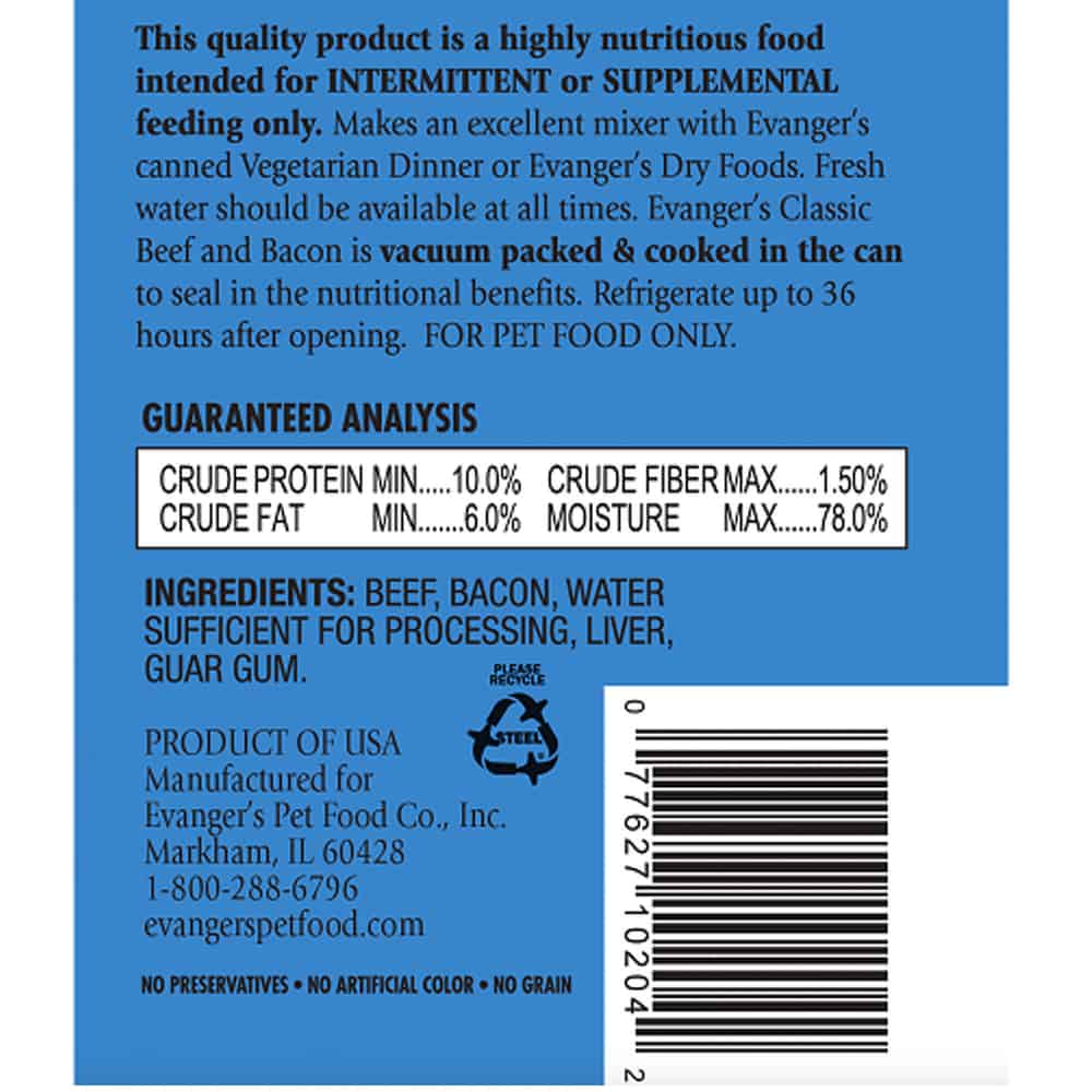 Evanger's Beef & Bacon is Grain-Free and Gluten-Free, and makes a great complement to our Super Premium dry foods, or can be balanced with Evanger's canned Vegetarian Dinner.